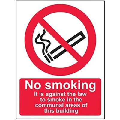 Clearly establishes Areas where smoking is prohibited to employees and visitors. Complies with the Smoke-free (Signs) Regulations 2007 Conforms to EN ISO 7010:2012 - Prohibition signs feature a red circular symbol of at least 35% of the total sign Areas, on a white background, with a black pictogram Portrait Orientation. Sign reads "No Smoking. It Is Against The Law To Smoke In The Communal Areas Of This Building" Highly durable Self Adhesive Vinyl material and screen printed message will stand the test of time Sign measures 150 x 200mm. Self Adhesive material will adhere securely to most surfaces