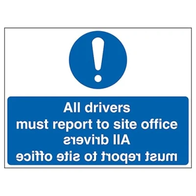 V Safety All Drivers Must Report To Site Office Mirrored 600 x 450 mm Glow In The Dark Self Adhesive Vinyl Sign