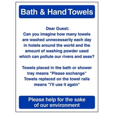 Helps to fulfil legal obligations to advise employees and visitors of specific actions and behaviour which must be adhered to in order to ensure personal safety as per Health and Safety (Safety Signs & Signals) Regulations 1996 Conforms to EN ISO 7010:2012 - Mandatory Signs feature a round symbol with a blue background of at least 50% of the total sign area, with a white pictogram and text Portrait Orientation. Sign reads "Bath & Hand Towels. Towels Placed In The Bath or Shower Tray Means: Please Exchange. Towels Replaced On The Towel Rails Means: I'll Use It Again" Highly durable Self Adhesive Vinyl material and screen printed message will stand the test of time Sign measures 150 x 200mm. Self Adhesive material will adhere securely to most surfaces