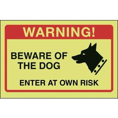 V Safety Beware Of The Dog, Enter At Own Risk Sign 200mm x 150mm Photoluminescent Self Adhesive Vinyl