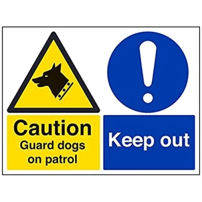 Helps to fulfil legal obligations to inform employees, visitors and the general public of potential hazards as per Health and Safety (Safety Signs & Signals) Regulations 1996 Conforms to EN ISO 7010:2012 - Warning signs feature a triangular symbol with a black pictogram and yellow background occupying at least 50% of the total sign area Landscape Orientation. Sign reads "Caution. Guard Dogs On Patrol. Keep Out" Highly durable 1mm plastic material and screen printed message will stand the test of time Sign measures 400 x 300mm