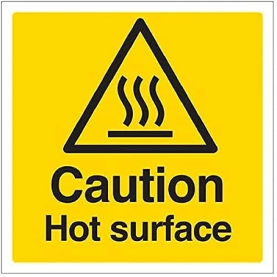 Helps to fulfil legal obligations to inform employees, visitors and the general public of potential hazards as per Health and Safety (Safety Signs & Signals) Regulations 1996 Conforms to EN ISO 7010:2012 - Warning signs feature a triangular symbol with a black pictogram and yellow background occupying at least 50% of the total sign area Square Orientation. Sign reads "Caution. Hot Surface" Highly durable Self Adhesive Vinyl material and screen printed message will stand the test of time Sign measures 200 x 200mm. Self Adhesive material will adhere securely to most surfaces
