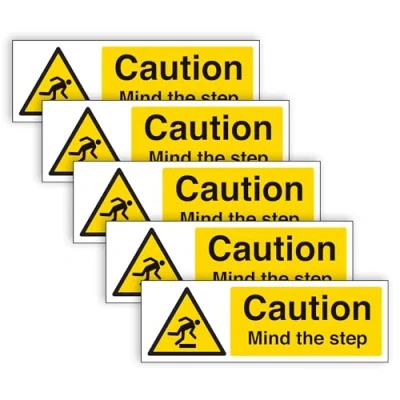 V Safety CAUTION MIND THE STEP Sign Highly Visible and Durable Self Adhesive Vinyl 300mm x 100mm (Pack of 5)