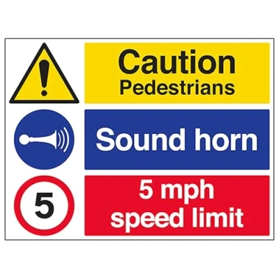 V Safety Caution Pedestrians Sound Horn 5mph Speed Limit 600 x 450 mm 2mm Rigid Plastic Sign