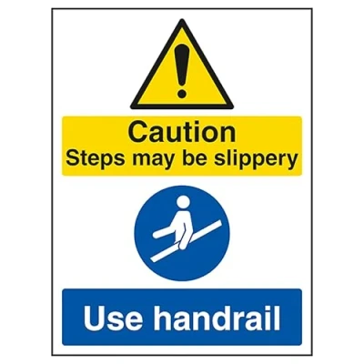 V Safety Caution Steps May Be Slippery/Use Handrail 150 x 200 mm Glow In The Dark 1mm Rigid Plastic Sign