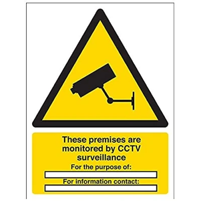 Helps to fulfil legal obligations to inform employees, visitors and the general public of potential hazards as per Health and Safety (Safety Signs & Signals) Regulations 1996 Conforms to EN ISO 7010:2012 - Warning signs feature a triangular symbol with a black pictogram and yellow background occupying at least 50% of the total sign area Portrait Orientation. Sign reads "These Premises Are Under CCTV Surveillance. For The Purpose Of. For Information Contact" Highly durable Self Adhesive Vinyl material and screen printed message will stand the test of time Sign measures 150 x 200mm. Self Adhesive material will adhere securely to most surfaces