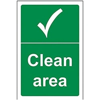 Helps to fulfil legal obligations to inform of the direction in which safety can be reached as per Health and Safety (Safety Signs & Signals) Regulations 1996 Conforms to EN ISO 7010:2012 by featuring a green background with a white pictogram or text positioned centrally Portrait Orientation. Sign reads "Clean Area" Highly durable 1mm plastic material and screen printed message will stand the test of time Sign measures 100 x 150mm