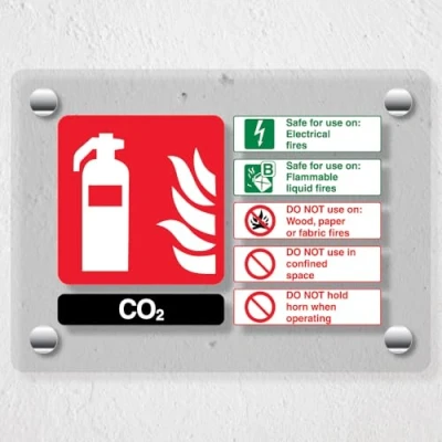V Safety CO2 Fire Extinguisher 150 x 100 mm Acrylic Perspex Cast Clear Sign