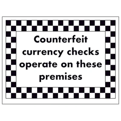 V Safety Counterfeit Currency Checks Operate On These Premises 200 x 150 mm Glow In The Dark Self Adhesive Vinyl Sign