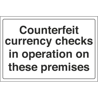 Landscape Orientation. Sign reads "Counterfeit Currency Checks In Operation On These Premises" Highly durable Self Adhesive Vinyl material and screen printed message will stand the test of time