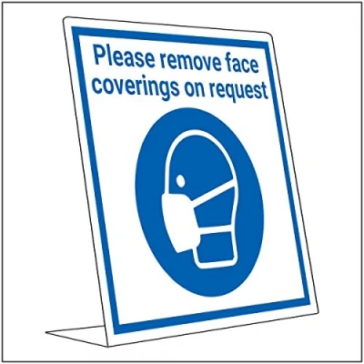 V Safety Covid Retail Desk Sign Remove Face Coverings 150mm x 200mm 2mm Rigid Plastic