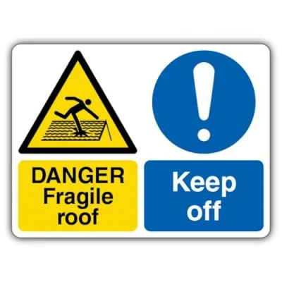 Wording & Purpose - Sign reads "Danger Fragile Roof Keep Off - Fragile Roof" and "Mandatory Exclamation"; designed to clearly communicate essential site information. Material & Build - 3 mm aluminium composite (ACM) that is lightweight, rigid, weatherproof and resistant to rust and corrosion. Visibility & Legibility – High‑contrast colours and standard symbols maximise readability; consistent typography supports rapid wayfinding. Compliance by Design – Manufactured to follow UK/EU safety-sign rules, using the correct EN ISO 7010 pictograms, shapes and colour coding, with layouts aligned to HSE Safety Signs & Signals Regulations (1996) and BS 5499 legibility principles for clear, consistent communication. Made in Britain – Manufactured in Britain using premium materials for dependable quality, durable finishes and fast turnaround; engineered for high‑traffic commercial settings.