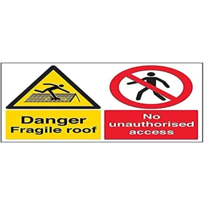 Helps to fulfil legal obligations to inform employees, visitors and the general public of potential hazards as per Health and Safety (Safety Signs & Signals) Regulations 1996 Conforms to EN ISO 7010:2012 - Warning signs feature a triangular symbol with a black pictogram and yellow background occupying at least 50% of the total sign area Landscape Orientation. Sign reads "Danger. Fragile Roof. No Unauthorised Access" Highly durable Self Adhesive Vinyl material and screen printed message will stand the test of time Sign measures 400 x 300mm. Self Adhesive material will adhere securely to most surfaces Number of items: 1; Unit count: 1.0