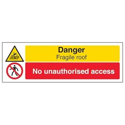 V Safety Danger Fragile Roof/No Unauthorised Landscape 600 x 200 mm 2mm Rigid Plastic Sign