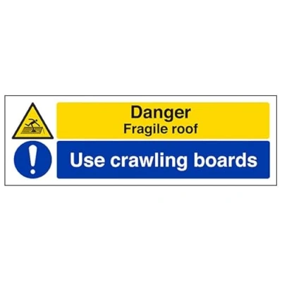 V Safety Danger, fragile roof/Use crawling boards 900 x 300 2mm Rigid Plastic Sign
