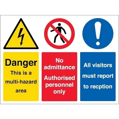 Communicates three critical messages at once—Danger, No Admittance, and Visitors Report to Reception—for clear access control. Guides all visitors to a single check-in point, reducing unauthorised entry and improving site oversight. Uses EN ISO 7010:2020 symbols and aligns with the Health & Safety (Safety Signs and Signals) Regulations 1996 for consistent recognition. Durable, high-contrast print with UV-stabilised inks for long-lasting legibility at entrances, barriers and reception routes. Self Adhesive Vinyl - Easy to apply, durable, and suitable for indoor and outdoor use.
