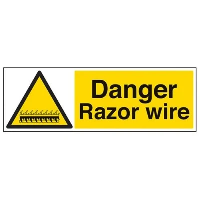 Helps to fulfil legal obligations to inform employees, visitors and the general public of potential hazards as per Health and Safety (Safety Signs & Signals) Regulations 1996 Conforms to EN ISO 7010:2012 - Warning signs feature a triangular symbol with a black pictogram and yellow background occupying at least 50% of the total sign area Landscape Orientation. Sign reads "Danger. Razor Wire" Highly durable Self Adhesive Vinyl material and screen printed message will stand the test of time Sign measures 600 x 200mm. Self Adhesive material will adhere securely to most surfaces