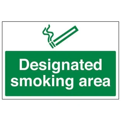 Clearly establishes areas where smoking is prohibited to employees and visitors. Complies with the Smoke-free (Signs) Regulations 2007 Conforms to EN ISO 7010:2012 - Prohibition signs feature a red circular symbol of at least 35% of the total sign area, on a white background, with a black pictogram Landscape Orientation. Sign reads "Designated Smoking Area" Highly durable and heavy duty 2mm rigid plastic material Sign measures 400 x 300mm