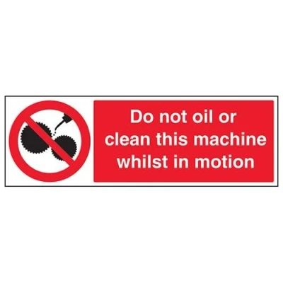 Clearly displays prohibited and potentially dangerous actions which employees and visitors must avoid in the interests of health and safety as per Health and Safety (Safety Signs & Signals) Regulations 1996 Conforms to EN ISO 7010:2012 - Prohibition signs feature a red circular symbol of at least 35% of the total sign area, on a white background, with a black pictogram Landscape Orientation. Sign reads "Do Not Oil or Clean This Machine Whilst In Motion" Highly durable Self Adhesive Vinyl material and screen printed message will stand the test of time Sign measures 600 x 200mm. Self Adhesive material will adhere securely to most surfaces