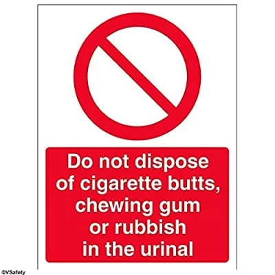 Clearly displays prohibited and potentially dangerous actions which employees and visitors must avoid in the interests of health and safety as per Health and Safety (Safety Signs & Signals) Regulations 1996 Conforms to EN ISO 7010:2012 - Prohibition signs feature a red circular symbol of at least 35% of the total sign area, on a white background, with a black pictogram Portrait Orientation. Sign reads "Do Not Dispose Of Cigarette Butts, Chewing Gum or Rubbish In Urinal" Highly durable Self Adhesive Vinyl material and screen printed message will stand the test of time Sign measures 150 x 200mm. Self Adhesive material will adhere securely to most surfaces