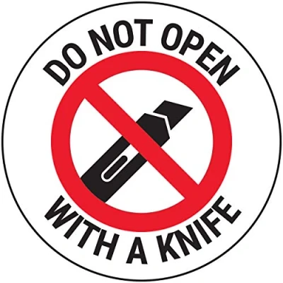 V Safety Do Not Open With A Knife Sticker 50mm Diameter (Roll of 250)