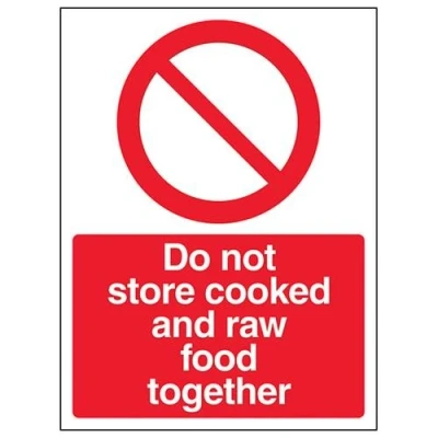Helps to fulfil legal obligations to remind staff and visitors to wear the appropriate PPE in catering environments to ensure personal safety and maintain hygiene levels Conforms to EN ISO 7010:2012 - Mandatory Signs feature a round symbol with a blue background of at least 50% of the total sign area, with a white pictogram and text Portrait Orientation. Sign reads "Do Not Store Cooked And Raw Food Together" Highly durable 1mm plastic material and screen printed message will stand the test of time Sign measures 150 x 200mm