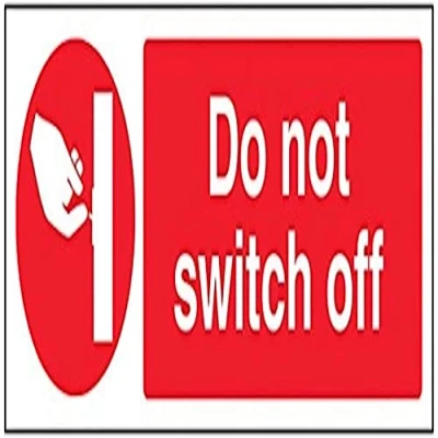 Clearly displays prohibited and potentially dangerous actions which employees and visitors must avoid in the interests of health and safety as per Health and Safety (Safety Signs & Signals) Regulations 1996 Conforms to EN ISO 7010:2012 - Prohibition signs feature a red circular symbol of at least 35% of the total sign area, on a white background, with a black pictogram Landscape Orientation. Sign reads "Do Not Switch Off" Highly durable Self Adhesive Vinyl material and screen printed message will stand the test of time Sign measures 300 x 100mm. Self Adhesive material will adhere securely to most surfaces