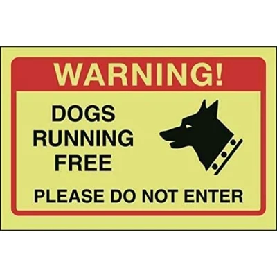 V Safety Dogs Running Free, Please Do Not Enter Sign 150mm x 100mm Photoluminescent Self Adhesive Vinyl