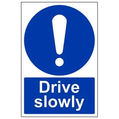 Helps to fulfil legal obligations to remind staff and visitors to wear the appropriate PPE when required to ensure personal safety as per Health and Safety (Safety Signs & Signals) Regulations 1996 Conforms to EN ISO 7010: 2012 - Mandatory Signs feature a round symbol with a blue background of at least 50% of the total sign area, with a white pictogram and text Portrait Orientation. Sign reads "Drive Slowly" Printed on strong 2mm thick white High Impact Polystyrene (HIPS) plastic - ideal for outdoor use