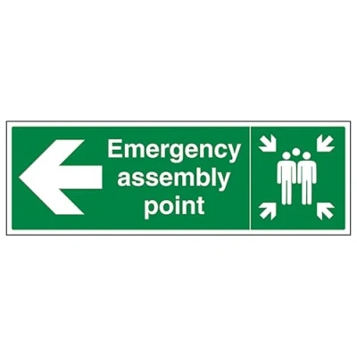 V Safety Emergency Assembly Point Arrow Left 450 x 150 mm 2mm Rigid Plastic Sign