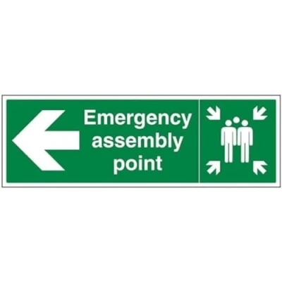 V Safety Emergency Assembly Point Arrow Left 900 x 300 2mm Rigid Plastic Sign