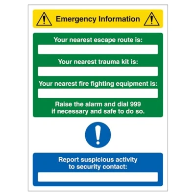 Ensure your Security Contact is easily identifiable, making it simple to report any suspicious behavior quickly and efficiently. Demonstrates a strong commitment to the safety and protection of everyone on site, providing reassurance to staff, visitors, and customers. Includes a versatile write-on space for adding key details such as the nearest escape route, trauma kit, fire equipment, or specific Security Contact information. Designed with bold, high-quality print and durable UV-stabilized inks, ensuring the message remains clear and visible over time. Available in a wide range of sizes and materials, allowing you to choose the perfect fit for any location or setting.