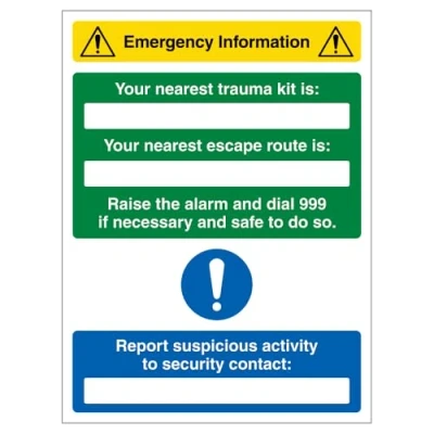 Clearly mark the locations of emergency trauma kits and escape routes for quick and easy access. Ensure the Security Contact is easily identifiable for prompt reporting of emergencies or concerns. Reinforce your commitment to safety, offering reassurance to all on-site. Includes a write-on space for key details such as trauma kits, escape routes, or Security Contact information. Features bold, durable print with UV-stabilized inks, available in various sizes and materials to suit any setting.