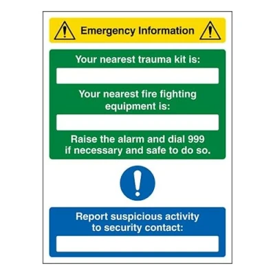 Enables fast location of essential emergency information such as, your nearest trauma kit and firefighting equipment Clearly indicates who your Security Contact is, ensuring any suspicious activity is reported in an emergency Having these protective security measures in place enhances any setting's emergency preparedness - Ensure your Security Contact can be easily identified for ease of reporting reporting suspicious activity Demonstrates your commitment to protect those on site and provide reassurance to all Durable, weatherproof, and rust-resistant, featuring a plastic core with aluminium sheets for strength.