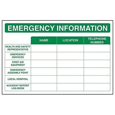 Helps to fulfil obligations to inform of where first aid supplies are kept as per First Aid At Work Regulations, as well as Health and Safety (Safety Signs & Signals) Regulations 1996 Conforms to EN ISO 7010:2012 Landscape Orientation. Sign reads "Emergency Information. Name. Location. Telephone Number" Highly durable Self Adhesive Vinyl material and screen printed message will stand the test of time Sign measures 300 x 200mm. Self Adhesive material will adhere securely to most surfaces