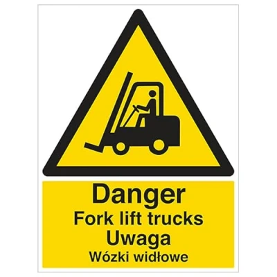 V Safety English/Polish Danger Fork lift Trucks 300 x 400mm 2mm Rigid Plastic Sign