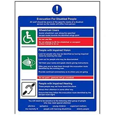 Provides essential information regarding action to be taken in the event of a fire Conforms to EN ISO 7010:2012 Portrait Orientation. Sign reads "Evacuation For Disabled People. All Staff Should Be Aware Of The Specific Needs Of A Disabled Person" Highly durable Self Adhesive Vinyl material and screen printed message will stand the test of time Sign measures 150 x 200mm. Self Adhesive material will adhere securely to most surfaces