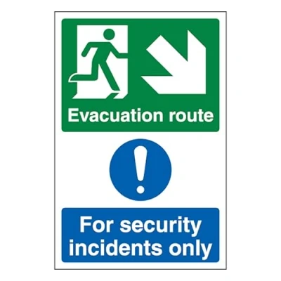 V Safety Evacuation Route Arrow Down Right/Security Incidents Only Portrait 200 x 300mm 2mm Rigid Plastic Sign