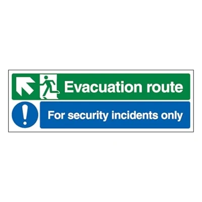 V Safety Evacuation Route Arrow Up Left/Security Incidents Only 300 x 100 mm Perspex Clear Cast Acrylic Sign