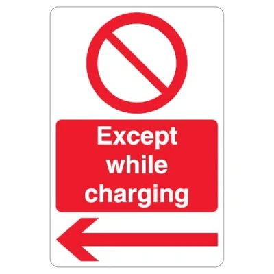 V Safety Except While Charging Prohibition Symbol Arrow Left 200 x 300mm 3mm Aluminium Composite Sign