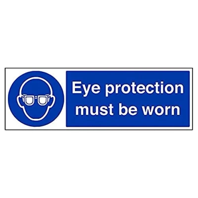 Helps to fulfil legal obligations to remind staff and visitors to wear the appropriate PPE when required to ensure personal safety as per Health and Safety (Safety Signs & Signals) Regulations 1996 Conforms to EN ISO 7010:2012 - Mandatory Signs feature a round symbol with a blue background of at least 50% of the total sign area with a white pictogram and text Landscape Orientation. Sign reads "Eye Protection Must Be Worn" Highly durable Self Adhesive Vinyl material and screen printed message will stand the test of time Sign measures 600 x 200mm. Self Adhesive material will adhere securely to most surfaces