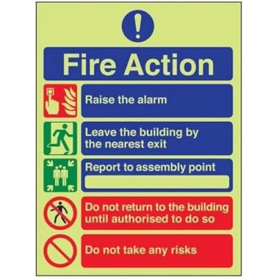 Provides essential information regarding action to be taken in the event of a fire Clear and easy to understand - white symbol and white text on a red background Conforms to EN ISO 7010:2027 Highly durable – made from either durable rigid plastic or self-adhesive flexible vinyl Easy to apply – both sign types come with their own adhesive