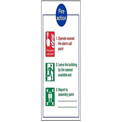 Provides essential information regarding action to be taken in the event of a fire Conforms to EN ISO 7010:2012 Portrait Orientation. Sign reads "Fire Action. Operate Nearest Fire Alarm Call Point. Leave The Building By The Nearest Available Exit. Report To Assembly Point" Highly durable Self Adhesive Vinyl material and screen printed message will stand the test of time Sign measures 200 x 300mm. Self Adhesive material will adhere securely to most surfaces