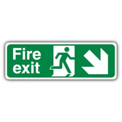 Wording & Purpose - Sign reads "Fire Exit Arrow Down Right"; designed to mark escape routes and exit doors for safe evacuation. Material & Build - 3 mm aluminium composite (ACM) that is lightweight, rigid, weatherproof and resistant to rust and corrosion; retro-reflective finish that enhances night-time and long-range visibility in low-light conditions. Visibility & Legibility – High‑contrast colours and standard symbols maximise readability; lightweight build supports easy placement and a consistent professional look across your site. Compliance by Design – Manufactured to follow UK/EU safety-sign rules, using the correct EN ISO 7010 pictograms, shapes and colour coding, with layouts aligned to HSE Safety Signs & Signals Regulations (1996) and BS 5499 legibility principles for clear, consistent communication. Made in Britain – Manufactured in Britain using premium materials for dependable quality, durable finishes and fast turnaround; engineered for high‑traffic commercial settings.