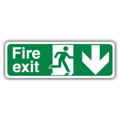 Wording & Purpose - Sign reads "Fire Exit Arrow Down"; designed to mark escape routes and exit doors for safe evacuation. Material & Build - 3 mm aluminium composite (ACM) that is lightweight, rigid, weatherproof and resistant to rust and corrosion; retro-reflective finish that enhances night-time and long-range visibility in low-light conditions. Visibility & Legibility – High‑contrast colours and standard symbols maximise readability; lightweight build supports easy placement and a consistent professional look. Compliance by Design – Manufactured to follow UK/EU safety-sign rules, using the correct EN ISO 7010 pictograms, shapes and colour coding, with layouts aligned to HSE Safety Signs & Signals Regulations (1996) and BS 5499 legibility principles for clear, consistent communication. Made in Britain – Manufactured in Britain using premium materials for dependable quality, durable finishes and fast turnaround; engineered for high‑traffic commercial settings.