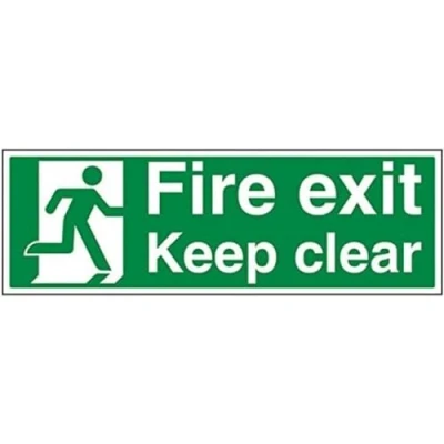Helps to fulfil obligations to identify escape routes in a fire emergency for all members of staff and visitors as per Health and Safety (Safety Signs & Signals) Regulations 1996 Conforms to EN ISO 7010:2012 by featuring a green background with a white pictogram or text positioned centrally Landscape Orientation. Sign reads "Fire Exit Keep Clear" Highly durable Self Adhesive Vinyl material and screen printed message will stand the test of time Sign measures 600 x 200mm. Self Adhesive material will adhere securely to most surfaces