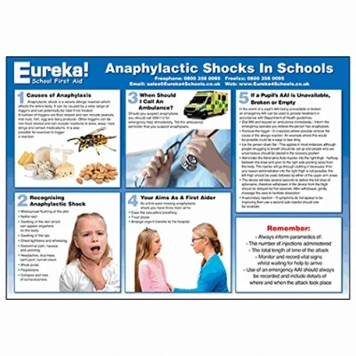Ideal for displaying in classrooms, changing rooms or staff rooms Easy to follow guide on how to recognise and treat a child suffering from an anaphylaxis attack Lightweight design allows poster to be easily attached to walls and repositioned whenever necessary Ideal for displaying in workplaces such as first aid rooms, workshops, offices and warehouses Printed directly on to polypropylene, producing high image quality