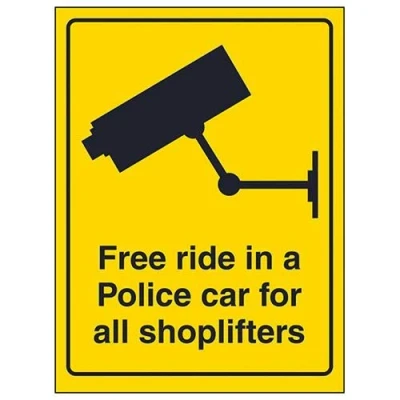 V Safety Free Ride In A Police Car For Shoplifters Sign 200mm x 300mm Self Adhesive Vinyl