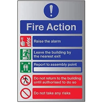 V Safety General Fire Action 5 Message Risks Sign 300mm x 400mm 3mm Brushed Alu Comp