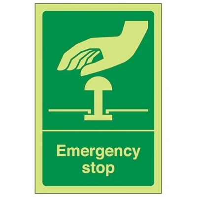 V Safety GITD Green Emergency Stop Portrait 100 x 150 mm Glow In The Dark Self Adhesive Vinyl Sign